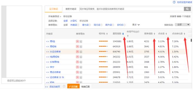 这里的点击率和市场均价等数据才是我们最终要参考的,如果是那些市场均价太高或者点击率太低的关键词就可以直接放弃了。因为对于初期涨分的直通车来说意味着出很高的价格才能得到一个有效的排名,并且得到的点击率也不会太高。所以我们选择的关键词是那种整体展现量还不错,点击率较高至少要5%以上并且市场均价不是很高的关键词。